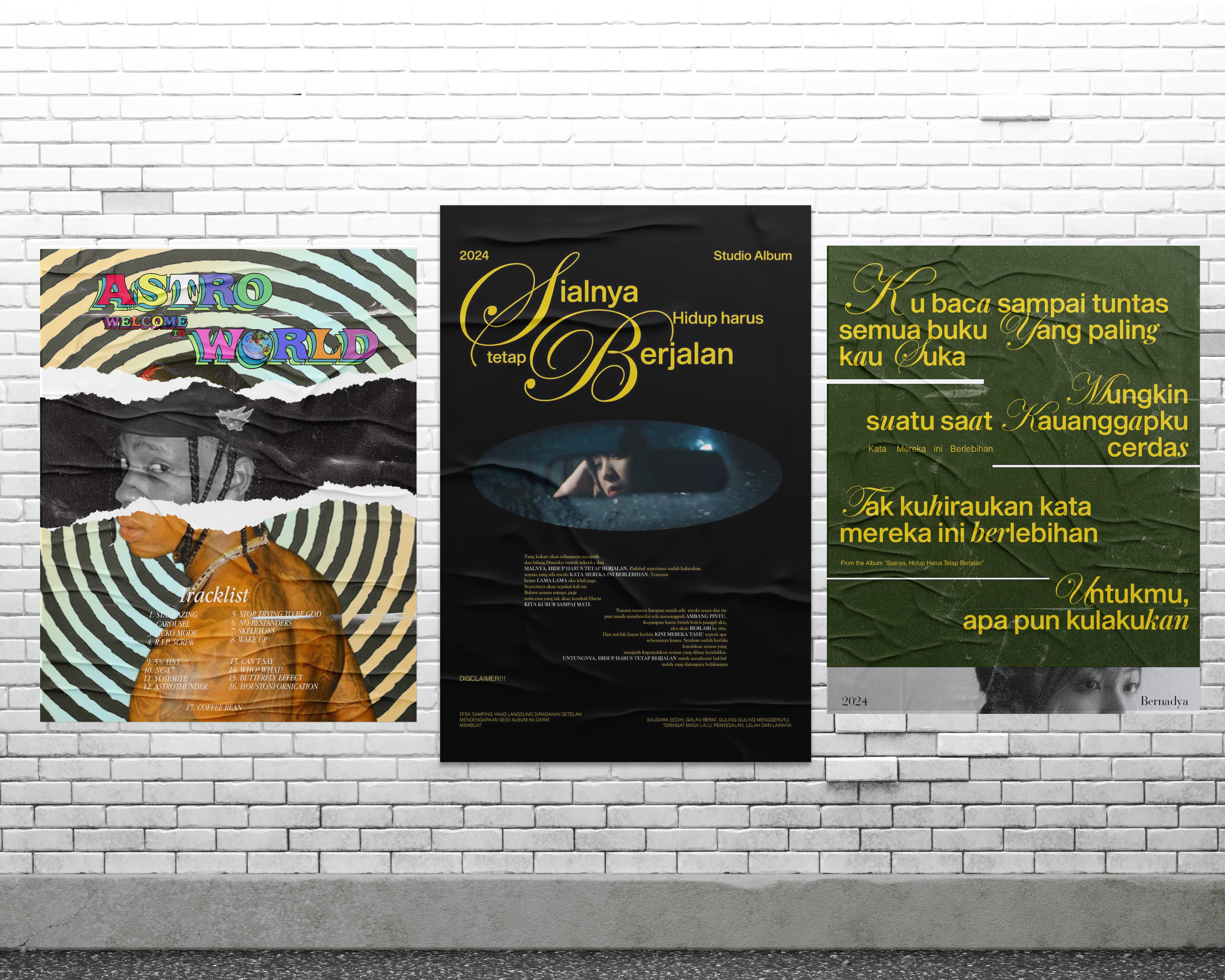 And these are my independent works. They include poster redesigns of some of my favorite artists, pieces I created to further develop my layouting skills, and my most recent independent project, which is a surrealist illustration.